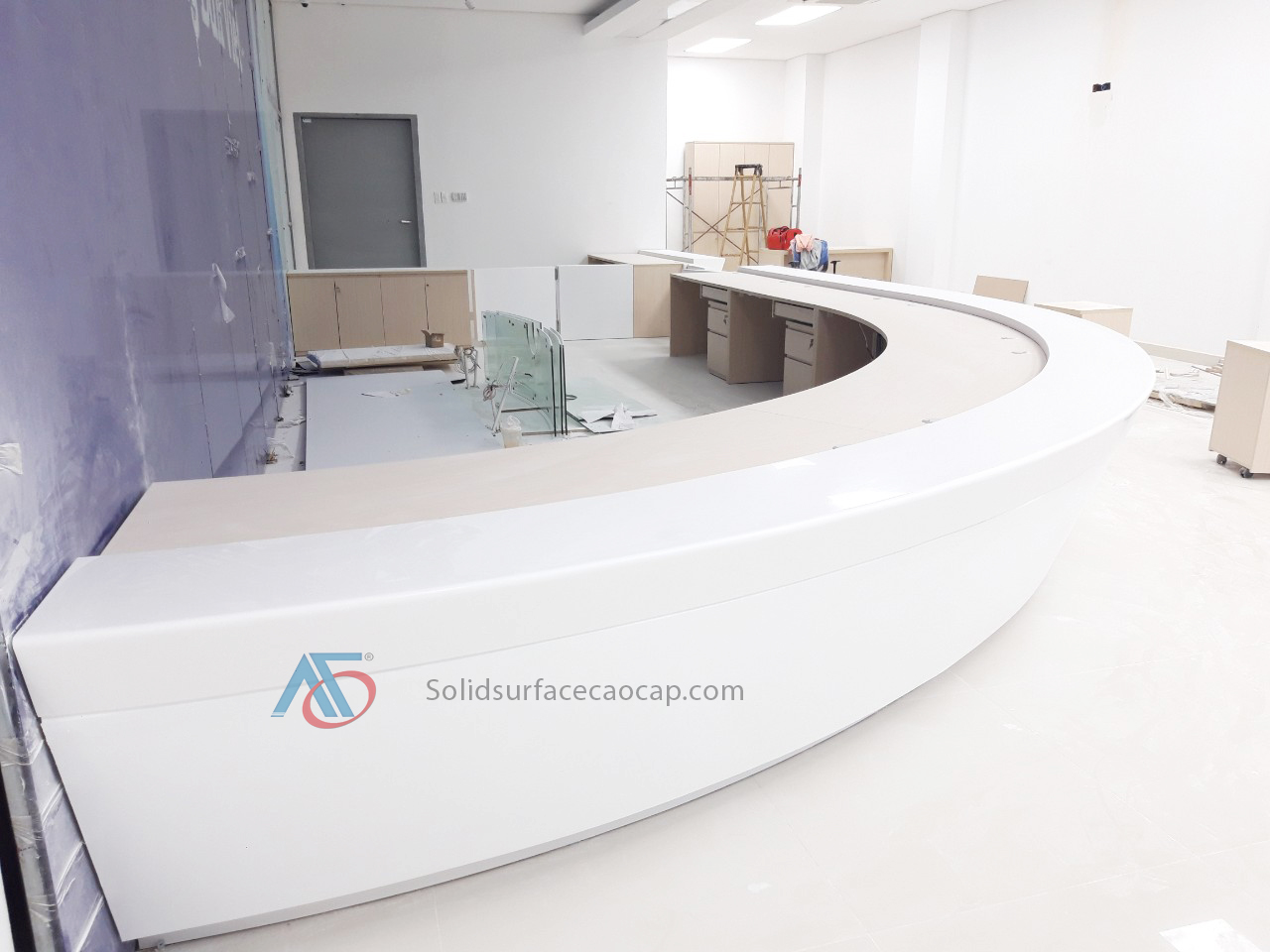 Nội thất AOF đã thi công mặt quầy lễ tân cong cho ngân hàng Bản Việt. Màu đá được chọn là đá trắng trơn Solid Surface Hàn Quốc.