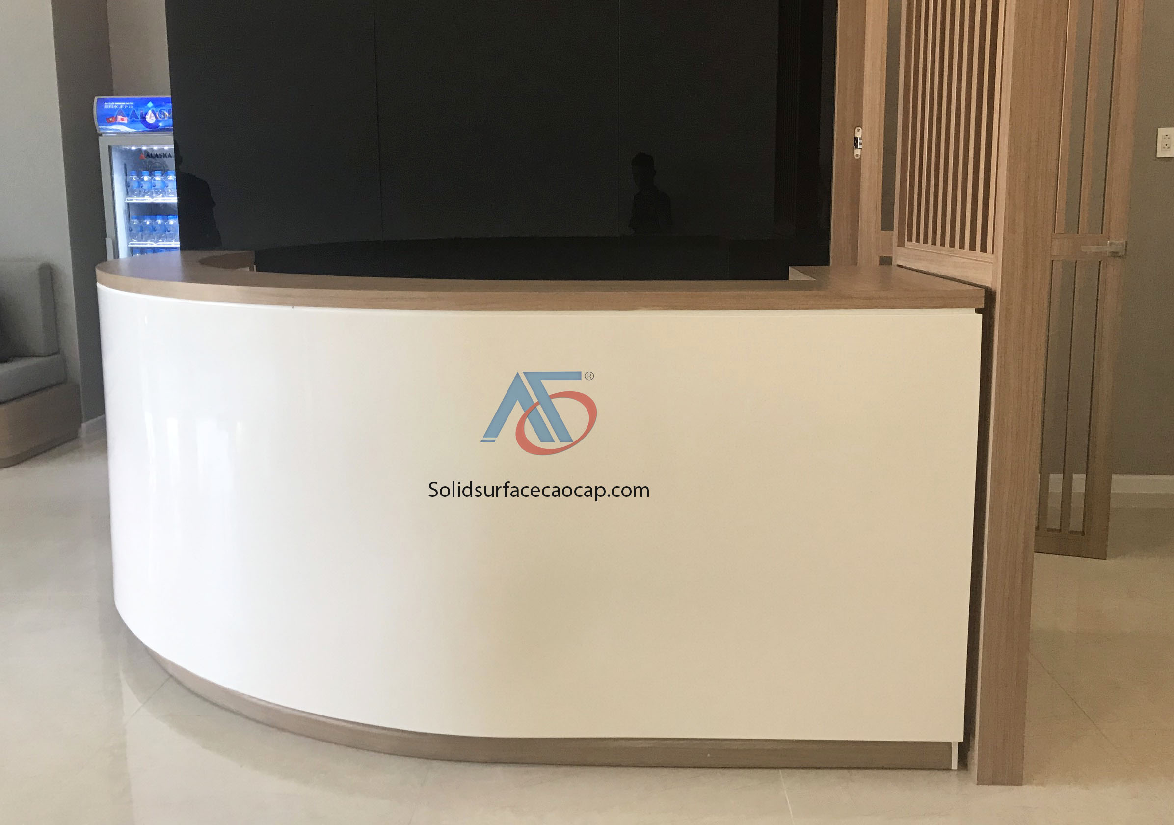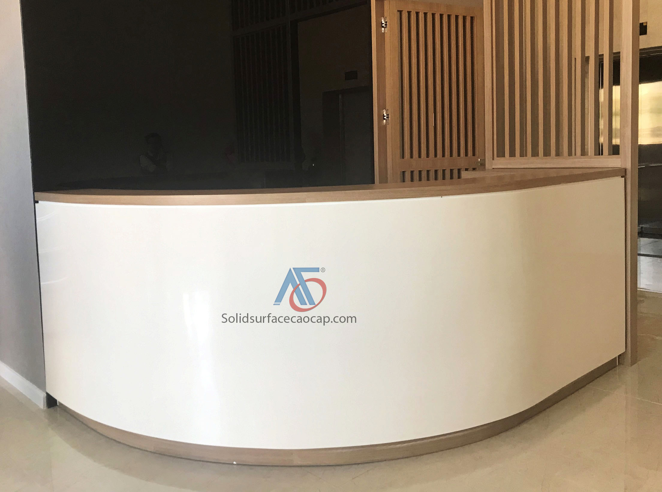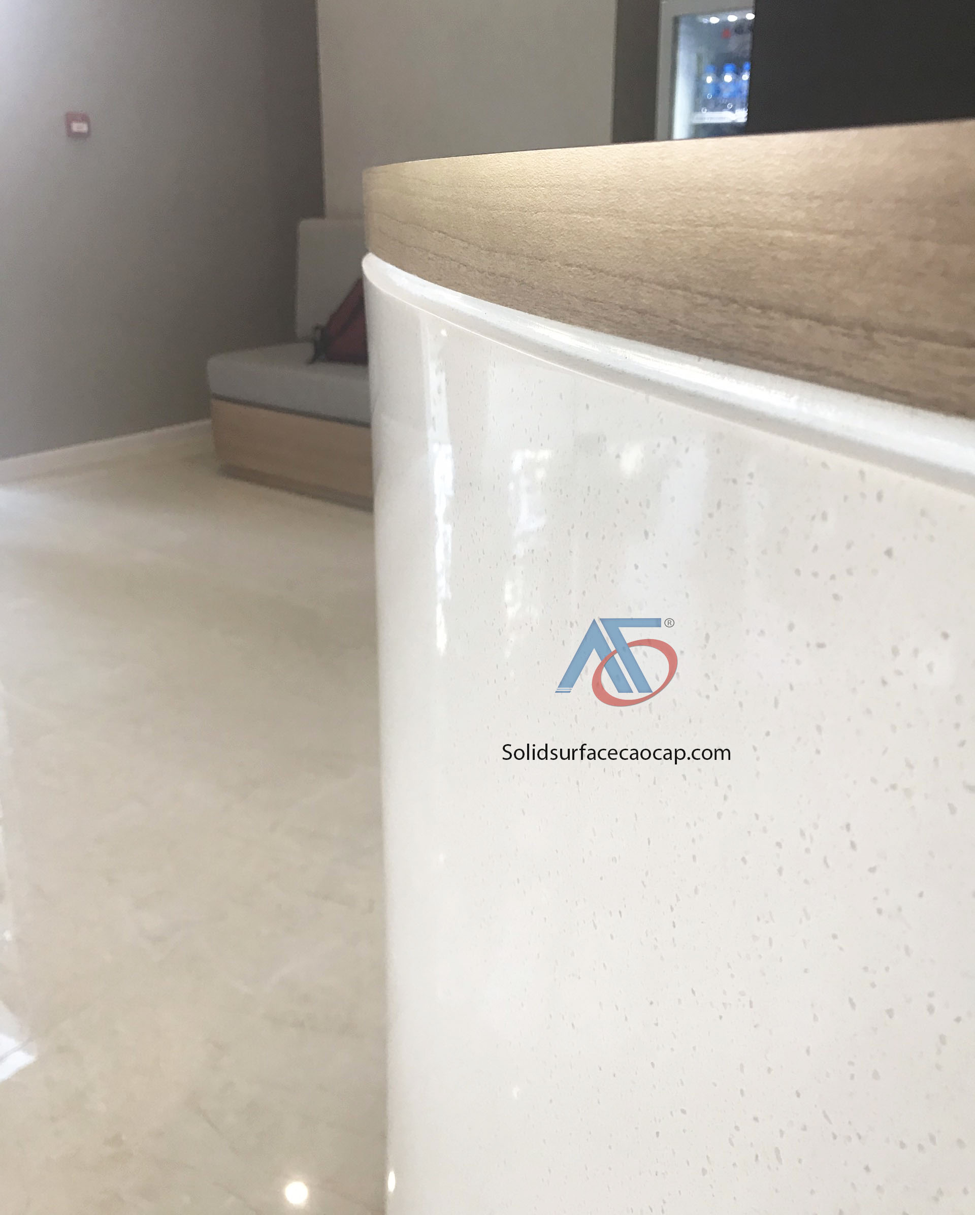 Quầy lễ tân với thiết kế cong tròn đặt biệt được ốp bằng mặt đá nhân tạo Solid Surface cao cấp.