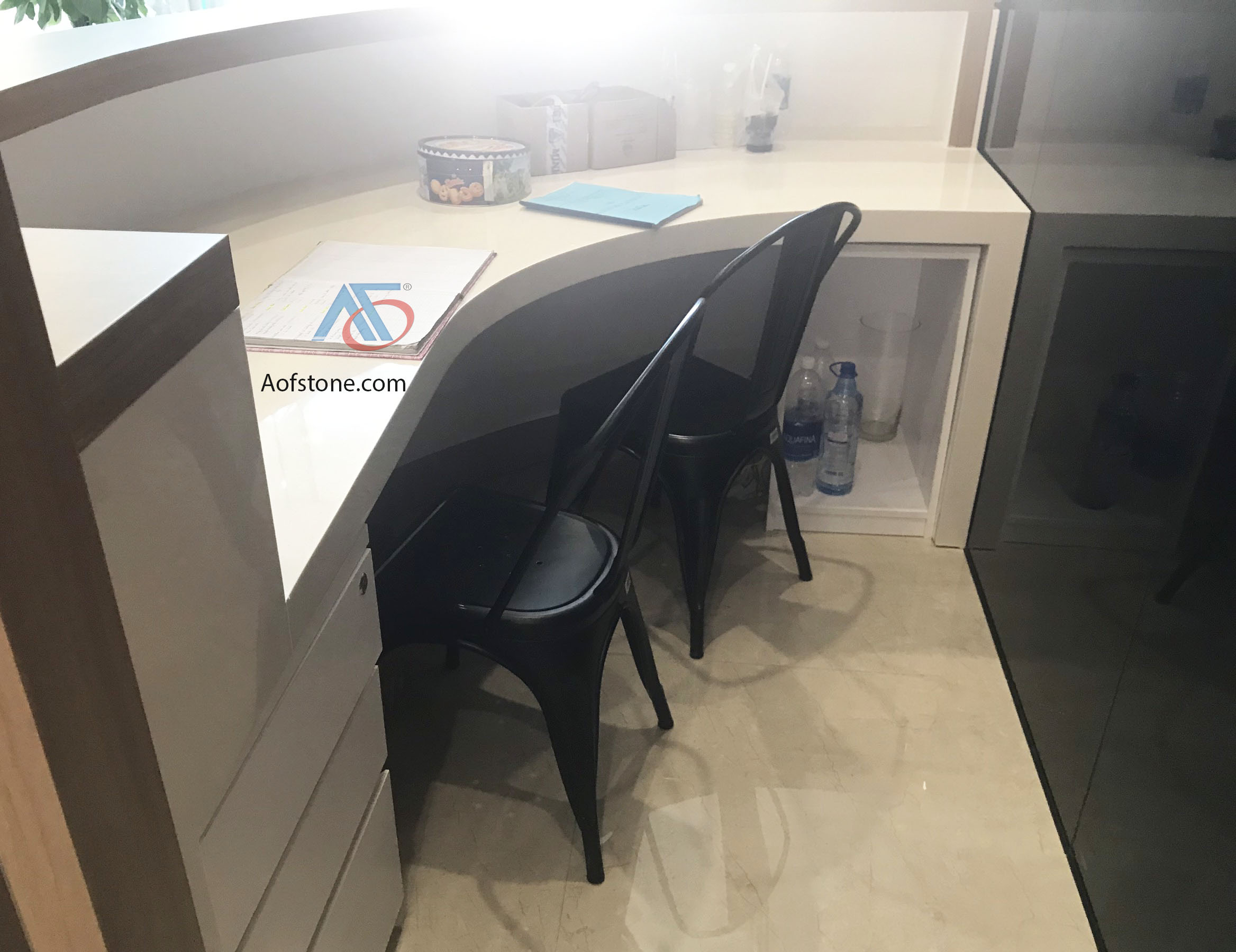 Nội thất AOF đã lắp đặt mặt đá cho quầy lễ tân với thiết kế cong tròn đặc biệt. Để có một quầy lễ tân đẹp thì phụ thuộc vào nhiều yếu tố như kích thước chất liệu tạo thành sản phẩm.