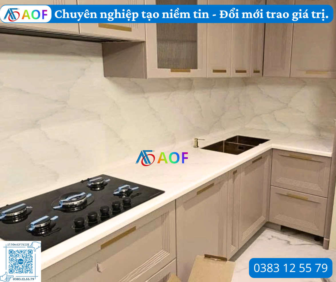 Bàn giao bếp đá Solid Surface liền vách, không đường nối tại Phú Thọ. Trải nghiệm không gian bếp hiện đại, sang trọng, dễ vệ sinh với dịch vụ chuyên nghiệp từ AOF.