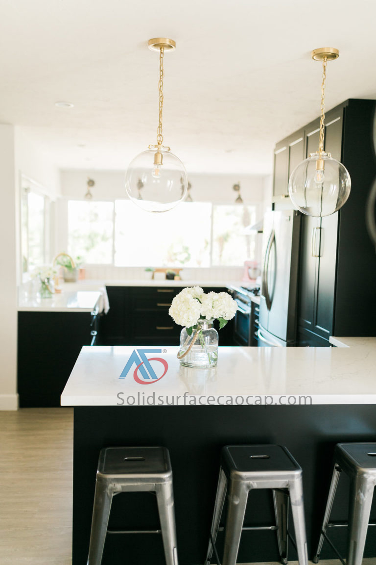 Mặt bàn đá Solid Surface khi có ánh đèn chiếu sáng thì mặt đá tạo cảm giác sáng mịn màng và không gian sạch sẽ.