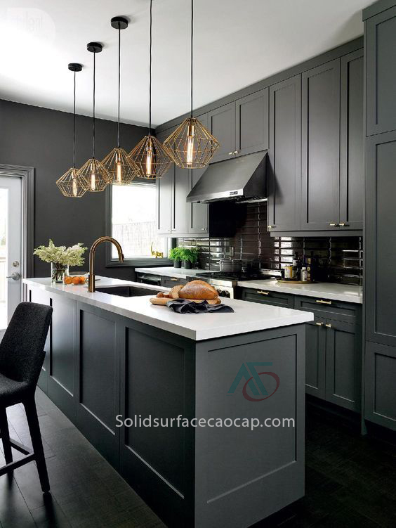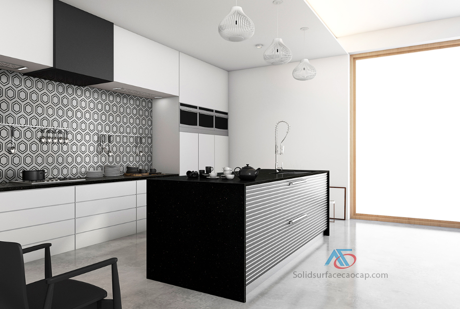 Phong cách phòng bếp hiện đại được thiết kế bếp chữ U và tủ bếp 2 màu tối giản là đen trắng, thêm các thiết bị hiện đại. Phù hợp với lối sống hiện đại. Với 2 màu tủ bếp đen trắng thì mặt đá bếp Solid Surface đều có màu đá phù hợp với phong cách này.,