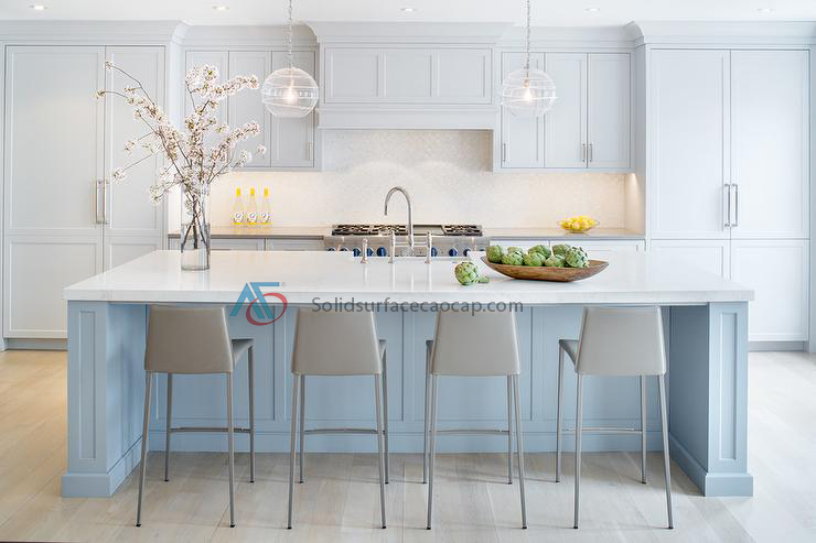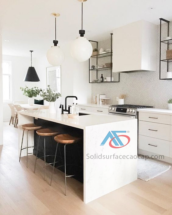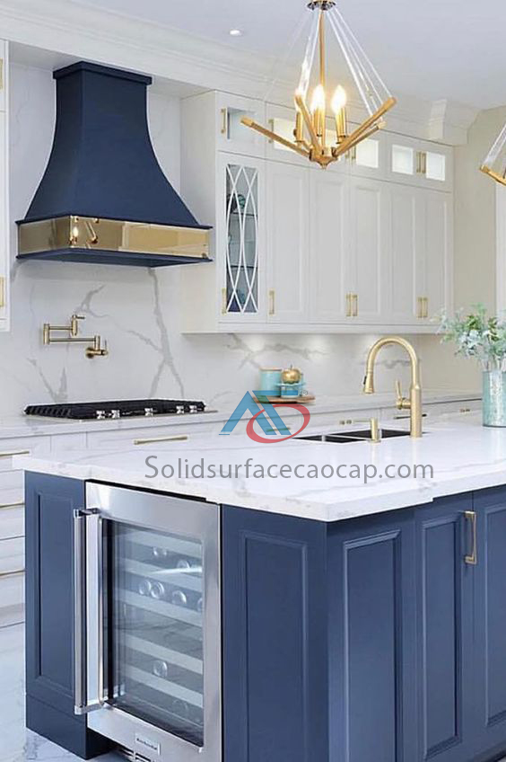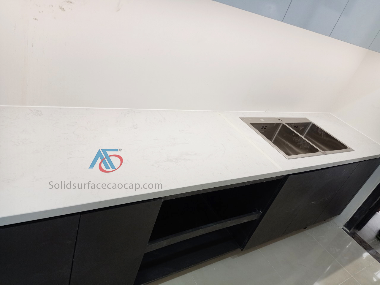 Mặt bàn bếp sử dụng là đá nhân tạo cũng là một sự lựa chọn chính xác. Hiện nay trên thị trường có rất nhiều loại đá nhân tạo: đá nhân tạo Solid Surface, đá nhân tạo Marble, đá nhân tạo Viscostone,..