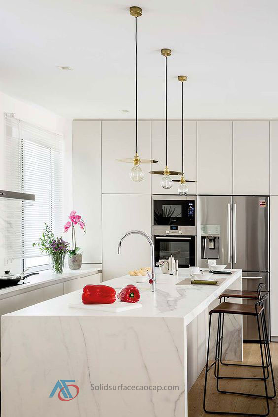 Mặt đá nhân tạo Solid Surface sẽ được ứng dụng và nội thất bếp là làm: mặt bàn bếp, bàn đảo, mặt dựng bếp, bàn ăn.