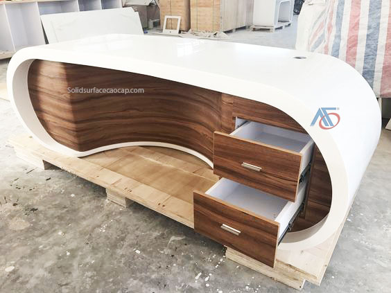 Mặt đá nhân tạo Solid Surface sẽ được ứng dụng vào ốp mặt quầy lễ tân với nhiều kiểu dáng từ đơn giản tới phức tạp. Có thể thi công được những kiểu dáng quầy lễ tân cong tròn và dài rộng mà bề mặt đá liền mạch không đường nối.
