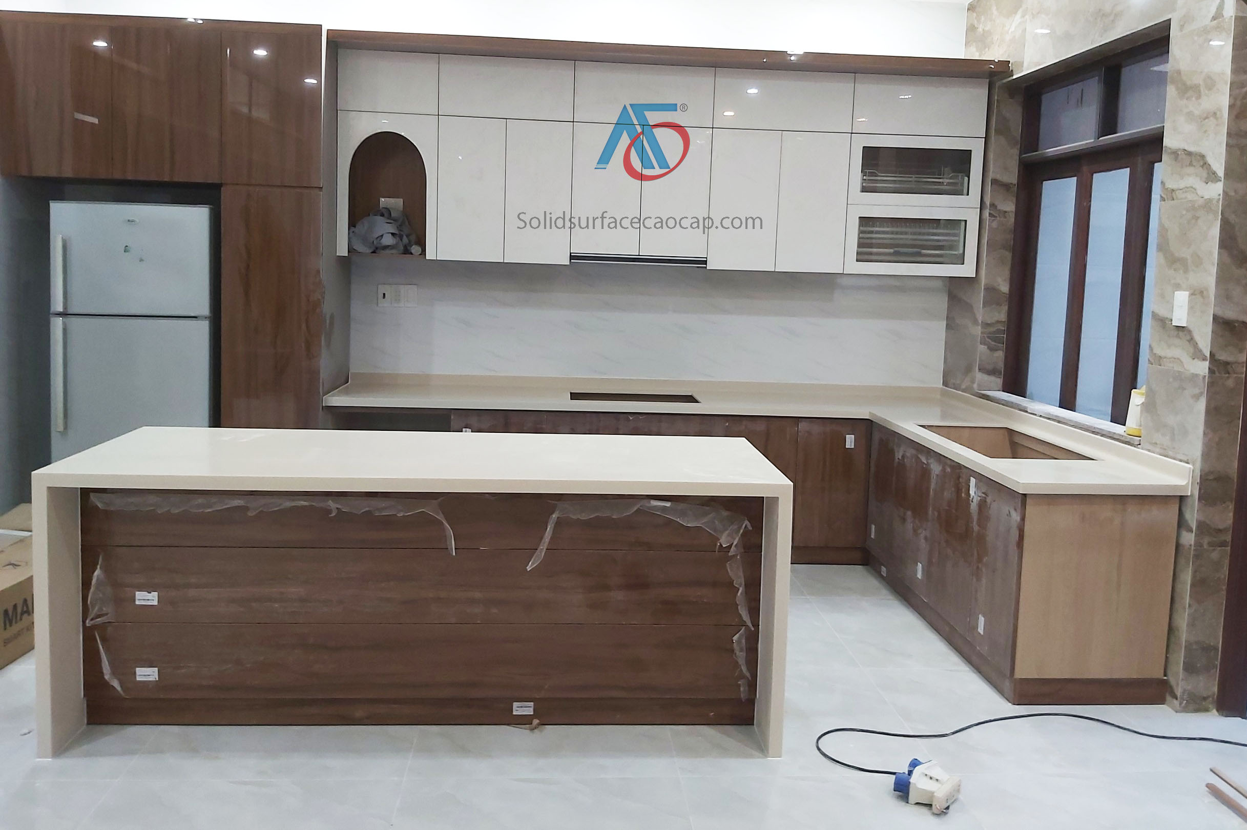 Bàn đảo được xem là một phần của tủ bếp tách rời so với phần bếp chính, không dựa vào tường và được nằm giựa không gian bếp và phía sau của người nấu ăn. Bàn đảo được ốp đá nhân tạo Solid Surface từ trên mặt và xuống cả 2 chân bàn bo vòng quanh tủ bàn đảo.