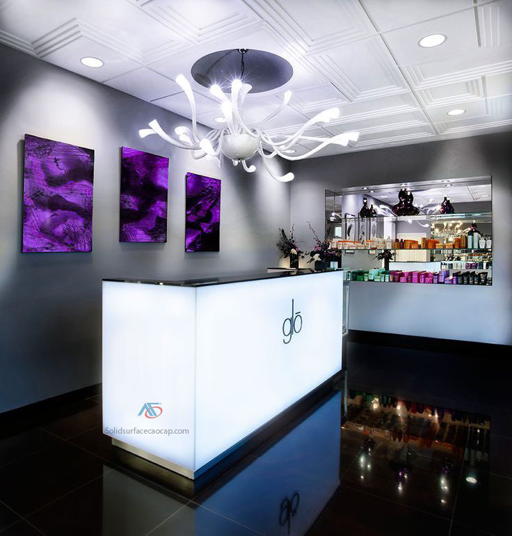 Nội thất AOF cung cấp và thi công hoàn thiện mặt đá nhân tạo Solid Surface làm mặt quầy lễ tân với kiểu dáng sang chảnh, hiện đại. Với những kiểu dáng thiết kế đặc biệt như làm uốn cong như tròn hình cánh cung, còn tròn nữa, mặt quầy xuyên sáng đều có thể thực hiện được bởi đá nhan tạo Solid Surface.