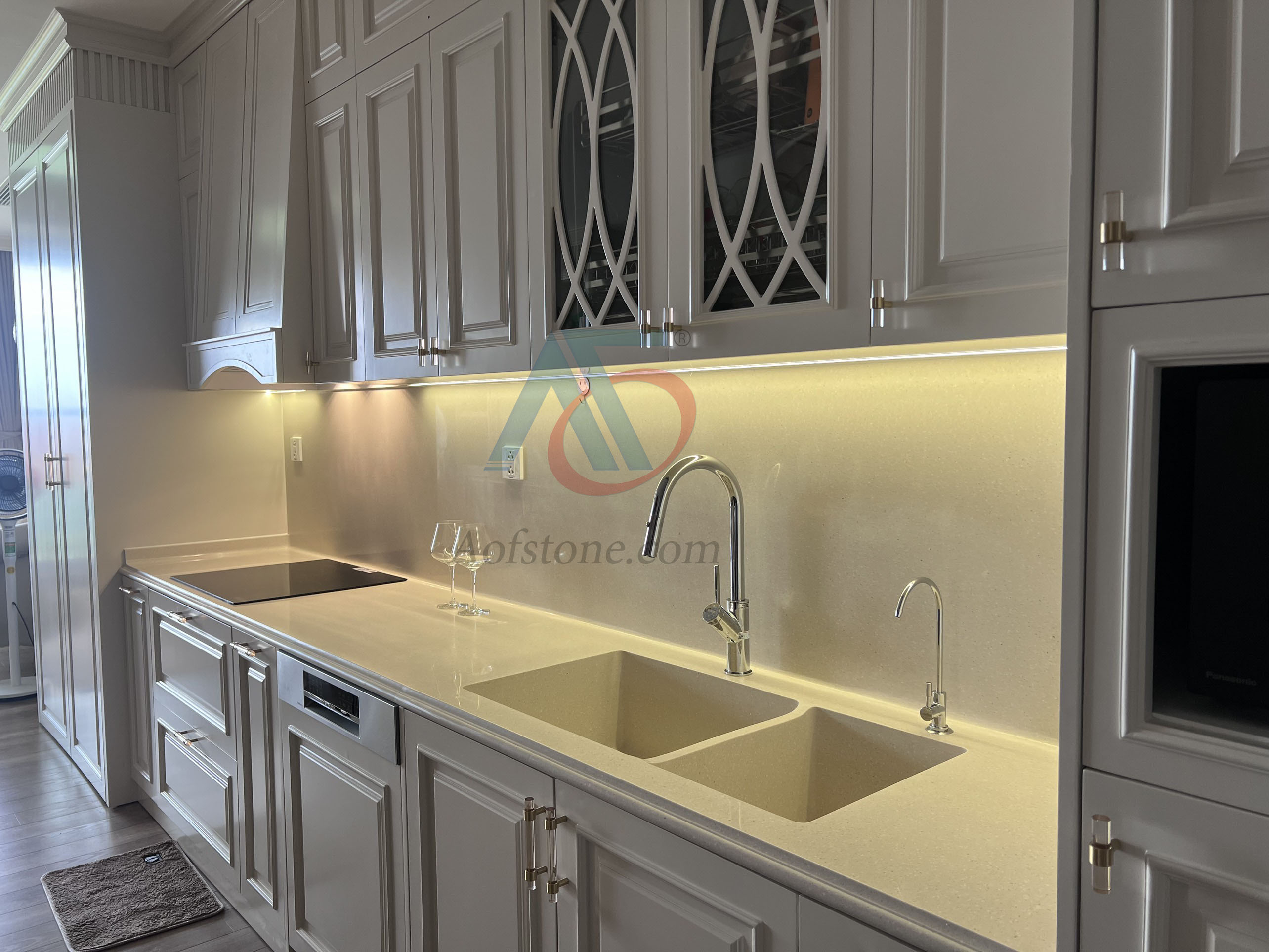 • Ốp tường: Ốp tường bếp bằng đá Solid Surface tạo điểm nhấn thẩm mỹ, dễ lau chùi.