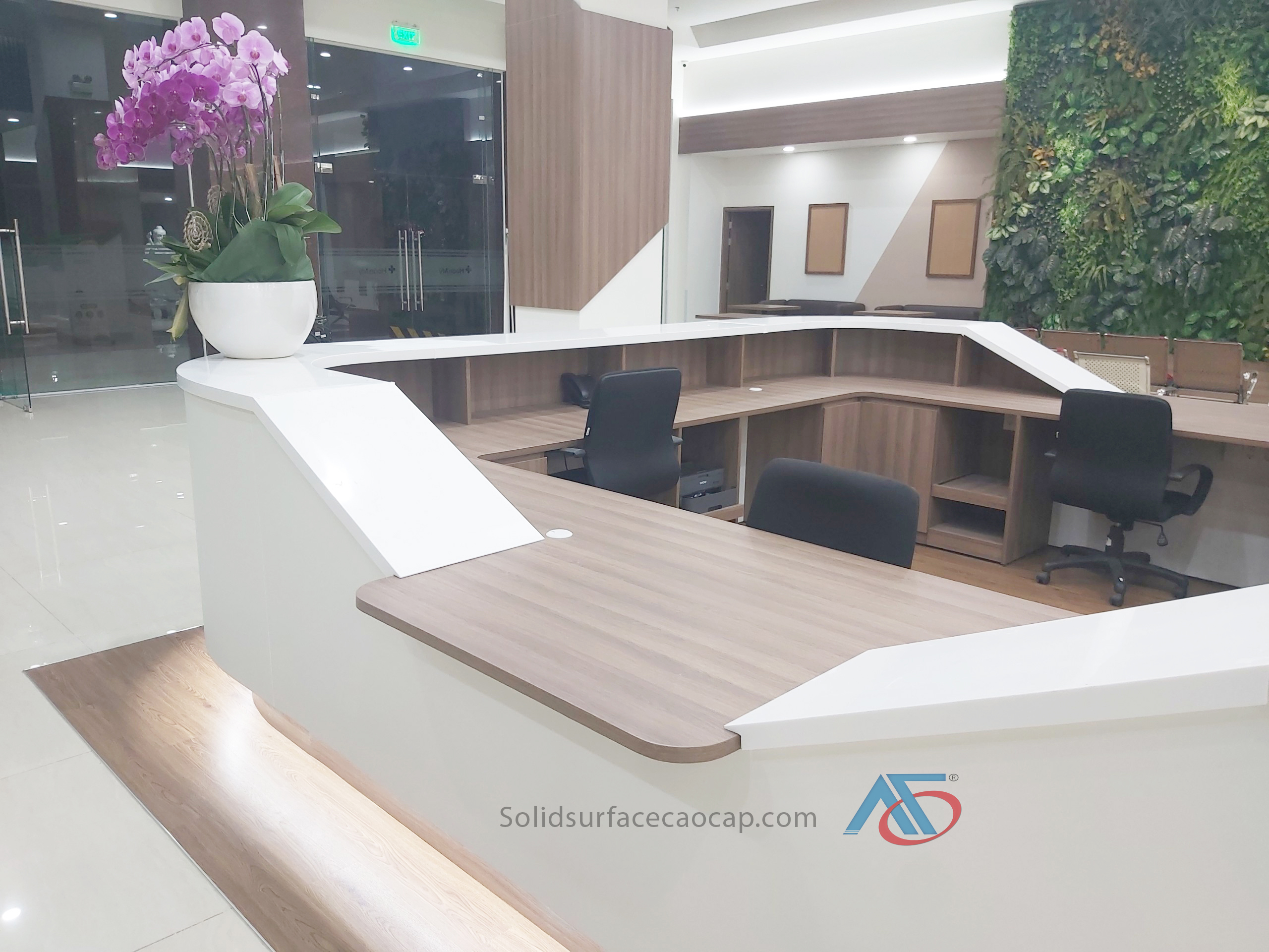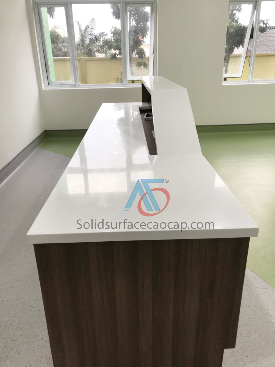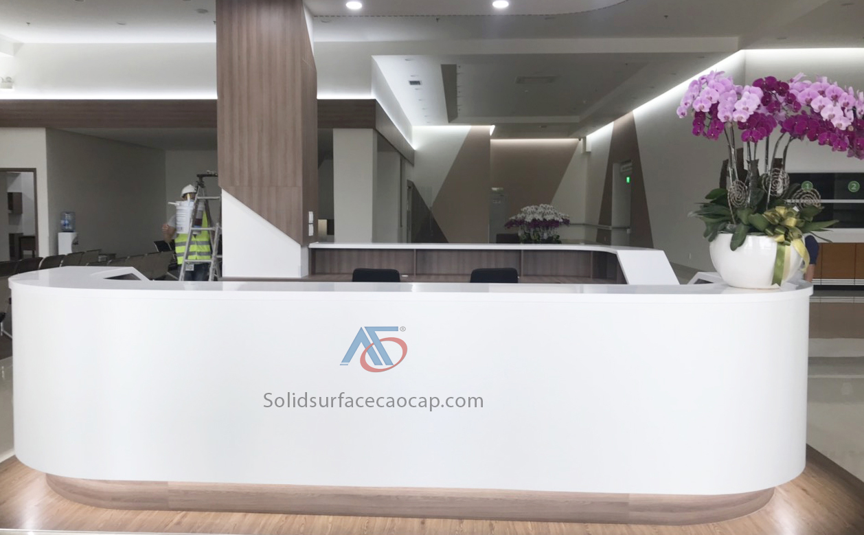 Nội thất AOF đã hoàn thiện lắp đặt mặt đá quầy lễ tân bằng đá nhân tạo Solid Surface trắng trơn.