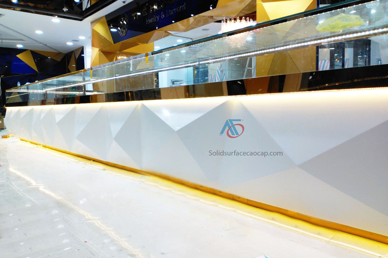 Phần tủ gỗ mặt ngoài được thiết kế làm ốp đá nhân tạo Solid Surface thành những đỉnh của những viên kim cương giúp làm sang trong cho quầy trưng bày. Mỗi góc cạnh của mặt đá được đánh bóng cẩn thận giúp mỗi đỉnh của mặt đá sáng bóng. Mỗi đỉnh đều được sắp xếp thành nhiều hướng tạo sự khác biệt và tăng sức hút cho cửa hàng.