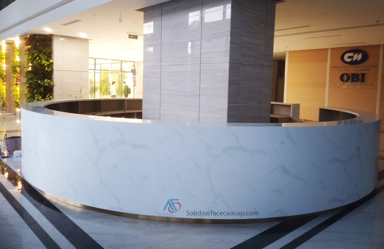 Quầy lễ tân được làm bằng đá nhân tạo Solid Surface vân mây AV-019 Sun Cloud. Quầy lễ tân được thiết kế vòng tròn quanh cột trụ của toàn nhà. Đá trắng vân mây có nền trắng kết hợp cùng những đường vân đen nhẹ nhàng tự nhiên.