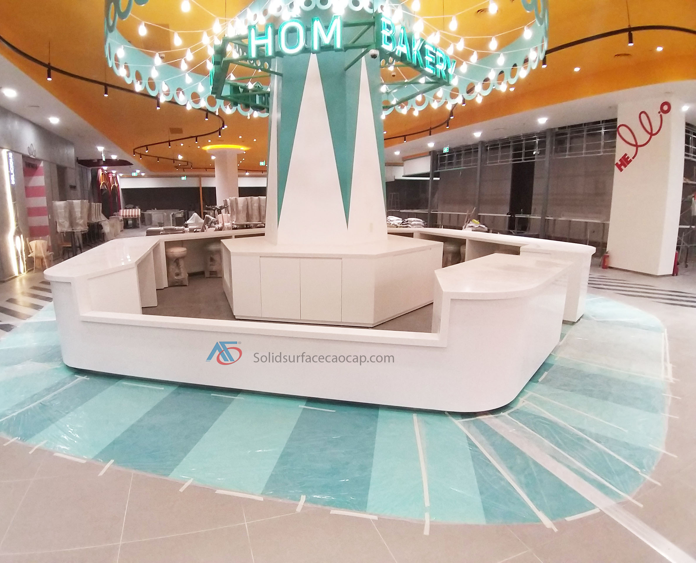 Quầy được làm ốp đá toàn bộ với kiểu dáng vô cùng độc nhất. Đá nhân tạo Solid Surface được thi công ốp toàn bộ để che đi phần tủ gỗ. Mặt đá được đánh bóng mềm mại và sáng bóng giúp quầy nhìn thon gọn và mảnh mai.