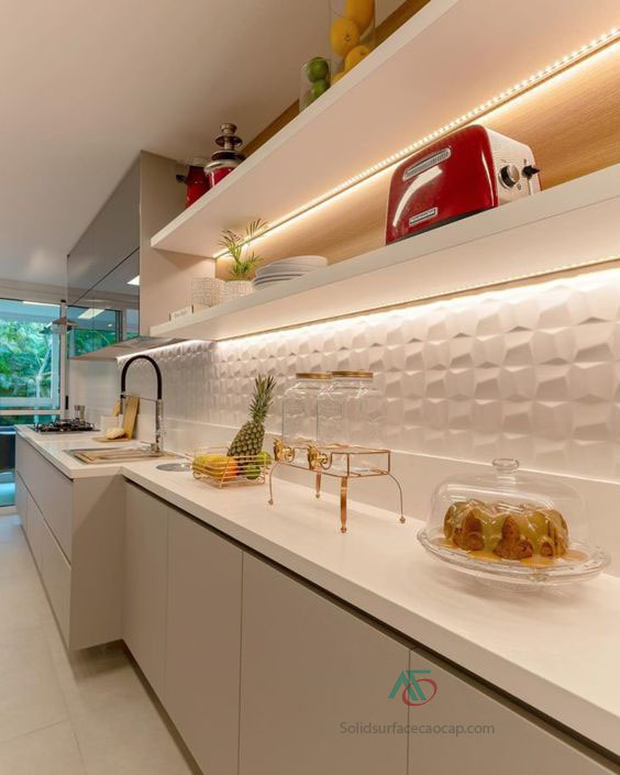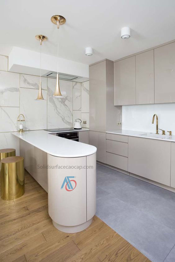 Không chỉ ưu điểm là không đường nối mà mặt đá nhân tạo Solid Surface rất bóng và sáng mịn màng giúp căn bếp của bạn trở nên sang trọng và đẳng cấp hơn!!